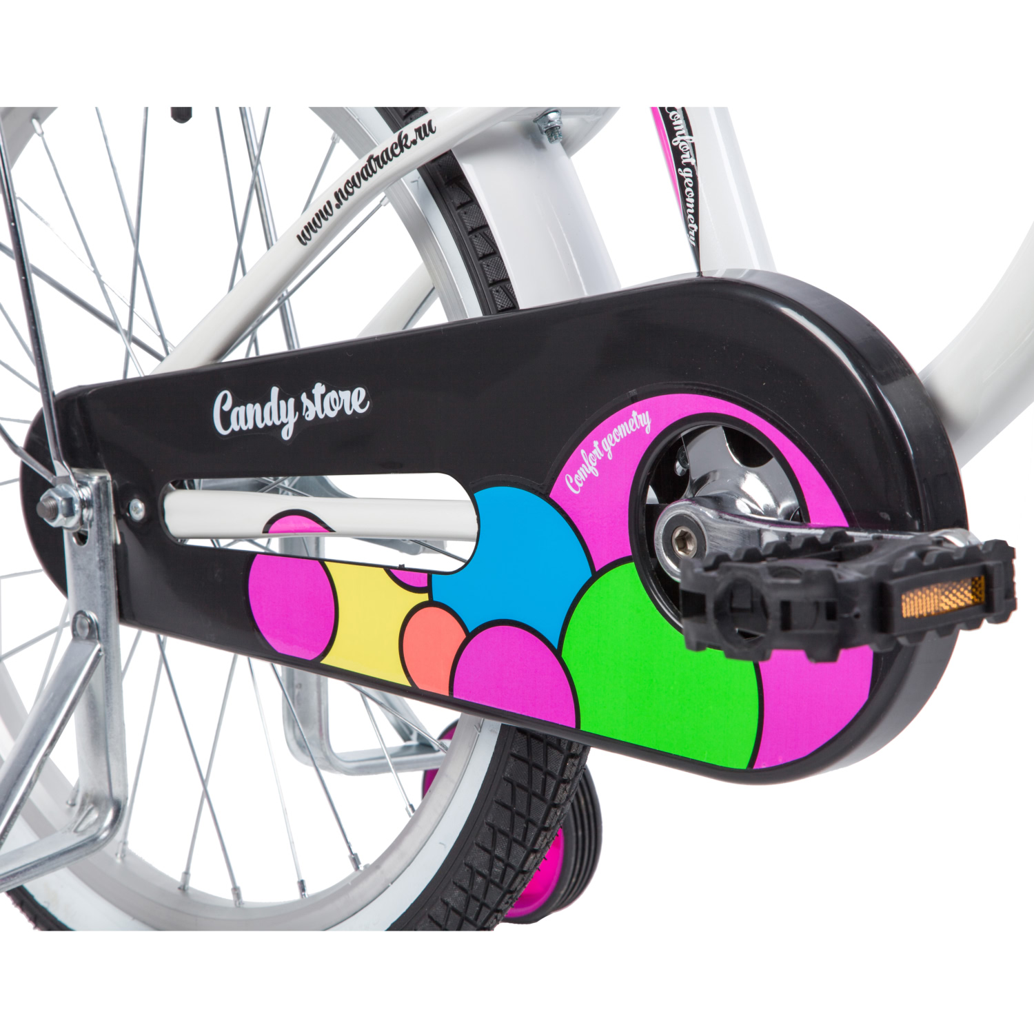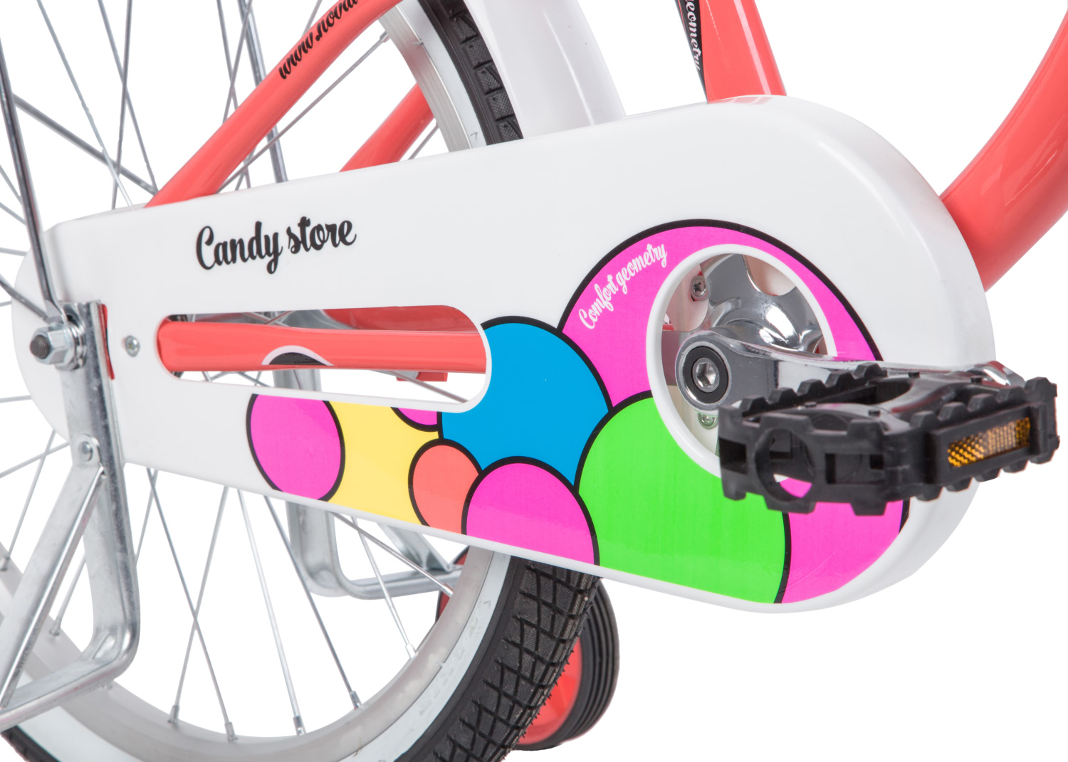 Городской велосипед для девочек Novatrack Candy с колесами 20 дюймов выглядит как вкусная конфета, а не велосипед. Стиль продуман до мелочей от изящной стальной рамы до яркого девчачьего дизайна. Велосипед оснащен одной скоростью и ножным тормозом. Велосипед комплектуется надежным багажником, сумочкой на руле, крыльями, звонком, катафотами. Полная защита цепи сохранит цепь велосипеда от пыли и грязи. Сидение и руль удобно регулируются по высоте, чтобы адаптировать байк под рост ребенка.
